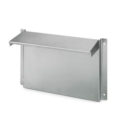 Wetterschutzdach zum Schutz des Generatoranschlusskastens (GAK) vor Umwelteinflüssen bei Montage im Außenbereich, aus Edelstahl, mit rückseitigem M8-Erdungsbolzen, inkl. Befestigungsmaterial für GAK und Erdungsleitung.