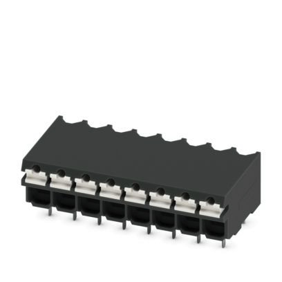 Leiterplattenklemme, Nennstrom: 17,5 A, Bemessungsspannung (III/2): 160 V, Nennquerschnitt: 1,5 mm², Anzahl der Potenziale: 8, Anzahl der Reihen: 1, Polzahl pro Reihe: 8, Artikelfamilie: SPT 1,5/..-H-THR, Rastermaß: 3,5 mm, Anschlussart: Push-in-Federanschluss, Montage: THR-Löten / Wellenlöten, Anschlussrichtung Leiter/Platine: 0 °, Farbe: schwarz, Pin-Layout: Lineares Pinning, Pinlänge [P]: 2,6 mm, Anzahl der Lötpins pro Potenzial: 2, Verpackungsart: verpackt im Karton