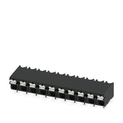 Leiterplattenklemme, Nennstrom: 17,5 A, Bemessungsspannung (III/2): 320 V, Nennquerschnitt: 1,5 mm², Anzahl der Potenziale: 10, Anzahl der Reihen: 1, Polzahl pro Reihe: 10, Artikelfamilie: SPT 1,5/..-H-THR, Rastermaß: 5,08 mm, Anschlussart: Push-in-Federanschluss, Montage: THR-Löten / Wellenlöten, Anschlussrichtung Leiter/Platine: 0 °, Farbe: schwarz, Pin-Layout: Lineares Pinning, Pinlänge [P]: 2,6 mm, Anzahl der Lötpins pro Potenzial: 2, Verpackungsart: verpackt im Karton