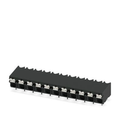 Leiterplattenklemme, Nennstrom: 17,5 A, Bemessungsspannung (III/2): 320 V, Nennquerschnitt: 1,5 mm², Anzahl der Potenziale: 11, Anzahl der Reihen: 1, Polzahl pro Reihe: 11, Artikelfamilie: SPT 1,5/..-H-THR, Rastermaß: 5,08 mm, Anschlussart: Push-in-Federanschluss, Montage: THR-Löten / Wellenlöten, Anschlussrichtung Leiter/Platine: 0 °, Farbe: schwarz, Pin-Layout: Lineares Pinning, Pinlänge [P]: 2,6 mm, Anzahl der Lötpins pro Potenzial: 2, Verpackungsart: verpackt im Karton