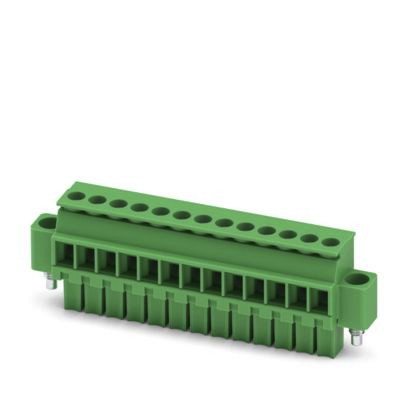 Leiterplattenstecker, Nennquerschnitt: 1,5 mm², Farbe: grün, Nennstrom: 8 A, Bemessungsspannung (III/2): 160 V, Kontaktoberfläche: Sn, Kontaktart: Buchse, Anzahl der Potenziale: 13, Anzahl der Reihen: 1, Polzahl: 13, Anzahl der Anschlüsse: 13, Artikelfamilie: MCVW 1,5/..-STF, Rastermaß: 3,5 mm, Anschlussart: Schraubanschluss mit Zughülse, Schraubenangriffsform: L Längsschlitz, Anschlussrichtung Leiter/Platine: -90 °, Stecksystem: COMBICON MC 1,5, Verriegelung: Schraubverriegelung, Befestigungsart: Schraubflansch, Verpackungsart: verpackt im Karton