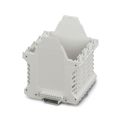 Tragschienengehäuse, Gehäuseunterteil mit Metallfußriegel, mit 4 FE-Kontakten, hohe Bauform, mit Lüftungsschlitzen, Breite: 90,4 mm, Höhe: 99 mm, Tiefe: 107,3 mm, Farbe: lichtgrau (ähnlich RAL 7035), Querverbindung: integrierter Busverbinder, Polzahl Querverbinder: 10, Busverbinder: 10 Parallelkontakte