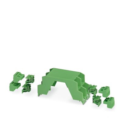Tragschienengehäuse, Set aus Gehäuseoberteil, 8 Stk. Leiterplatten-Grundleisten (3-polig) und 8 Stk. Leiterplattenklemmen mit Schraubanschluss (3-polig), Breite: 35,2 mm, Höhe: 99 mm, Tiefe: 45,85 mm, Farbe: grün (ähnlich RAL 6021)