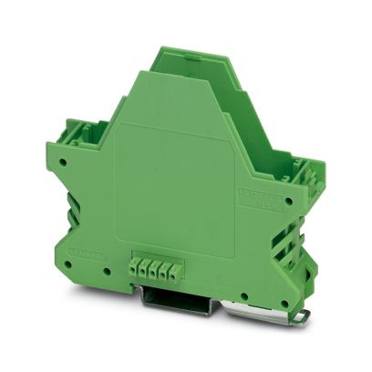Tragschienengehäuse, Gehäuseunterteil mit Metallfußriegel, flache Bauform, mit Lüftungsschlitzen, Breite: 22,6 mm, Höhe: 99 mm, Tiefe: 84,8 mm, Farbe: grün (ähnlich RAL 6021), Querverbindung: integrierter Busverbinder, Polzahl Querverbinder: 5, Busverbinder: 5 parallele Kontakte