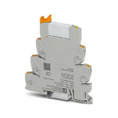 PLC-INTERFACE, bestehend aus Grundklemme PLC-BPT.../21 mit Push-in-Anschluss und steckbarem Miniaturrelais mit Leistungskontakt, zur Montage auf Tragschiene NS 35/7,5, 1 Wechsler, Eingangsspannung 12 V DC