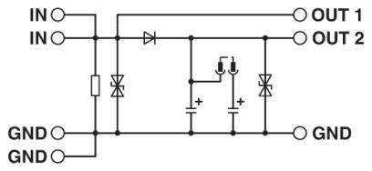 Klemme zur Filterung von Testpulsen sicherer Halbleiterausgänge mit einstellbaren Filterwerten (1,5 µF/11,5 µF), sowie zur EMV Filterung von 24 V-Signalen bis zu einer Stromstärke von 2 A.