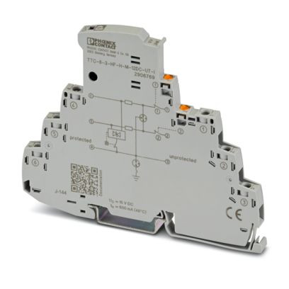 Überspannungsschutz mit integrierter Statusanzeige und Messertrennung für drei Signaladern mit gemeinsamen Bezugspotenzial. Für HF-Anwendungen und Telekommunikationsschnittstellen ohne Speisespannung (bis zu 90 MBit/s). Indirekte Erdung über Gasableiter. In sicherheitsgerichteten Kreisen bis SIL 3 einsetzbar.