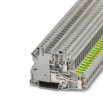 Bauelementreihenklemme, mit Prüfbuchsenschrauben zur Aufnahme von Prüfsteckern, Nennspannung: 500 V, Nennstrom: 0,5 A, Anzahl der Anschlüsse: 2, Anschlussart: Schraubanschluss, Bemessungsquerschnitt: 4 mm², Querschnitt: 0,14 mm² - 6 mm², Montageart: NS 35/7,5, NS 35/15, Farbe: grau