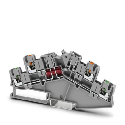Trennklemme, Der max. Belastungsstrom darf durch den Summenstrom aller angeschlossenen Leiter nicht überschritten werden. Strom und Spannung werden durch den eingesetzten Stecker bestimmt., doppelstöckig mit schräger Kontur und zwei Trennstellen, Nennspannung: 400 V, Nennstrom: 16 A, 1. und 2. Etage, Anschlussart: Push-in-Anschluss, Bemessungsquerschnitt: 2,5 mm², Querschnitt: 0,14 mm² - 4 mm², Montage: NS 35/7,5, NS 35/15, Farbe: grau