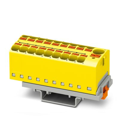 Verteilerblock, Nennspannung: 800 V, Nennstrom: 32 A, Anzahl der Anschlüsse: 19, Anschlussart: Push-in-Anschluss, Bemessungsquerschnitt: 4 mm², Abgriff, Querschnitt: 0,2 mm² - 6 mm², Push-in-Anschluss, Sammelanschluss, Bemessungsquerschnitt: 10 mm², Querschnitt: 0,5 mm² - 10 mm², Montageart: NS 35/7,5, NS 35/15, Farbe: gelb