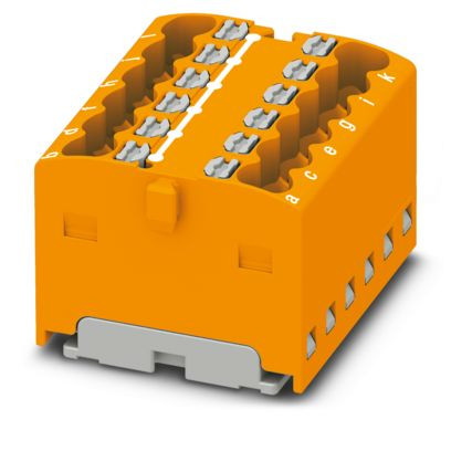 Verteilerblock, intern gebrückt, Nennspannung: 450 V, Nennstrom: 17,5 A, Anzahl der Anschlüsse: 12, Anschlussart: Push-in-Anschluss, Querschnitt: 0,14 mm² - 2,5 mm², Montageart: aufrasten auf Tragschienenadapter, Direktmontage mit Flansch, Fliegend, Farbe: orange