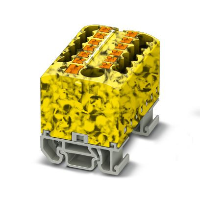 Verteilerblock, die Blöcke sind untereinander über den Leiterschacht brückbar, passende Steckbrücken siehe Zubehör, Block mit waagerechter Ausrichtung und integrierter Einspeisung, Nennspannung: 690 V, Nennstrom: 24 A, Anschlussart: Push-in-Anschluss, Abgriff, Querschnitt: 0,14 mm² - 4 mm², Push-in-Anschluss, Sammelanschluss, Bemessungsquerschnitt: 6 mm², Querschnitt: 0,5 mm² - 10 mm², Montageart: NS 15, Farbe: schwarz/gelb