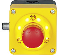 PITestop, Not-Halt/Kontaktblock inkl. Aufbaugehäuse, Set bestehend ausNotHalt-Taster beleuchtet mit Not-Halt Symbol und Logo und Kontaktblock2n/c, mit M12 Anschluss 5-polig.