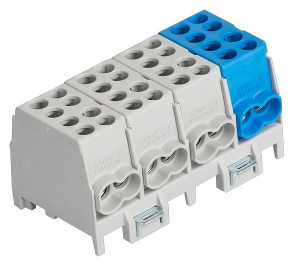 3 x grau / grey / gris, 1 x blau / blue / bleu, mehrpolig, Schnellbefestigung aus Stahlblech, Doppel-Schnellbefestigung bei 4- u. 5-pol., Minimodular kompatibel, VDE-zertifiziert, multipole, quick snap-on, galvanized steel, 2-fold locking for 4- and 5-pole, extendable with the mini modular range, VDE certified, multi polaire, attache rapide d‘acier galvanisé, 2 attaches rapide pour 4 et 5 pôle, compatible avec le système mini-modulaire, certifié par VDE,