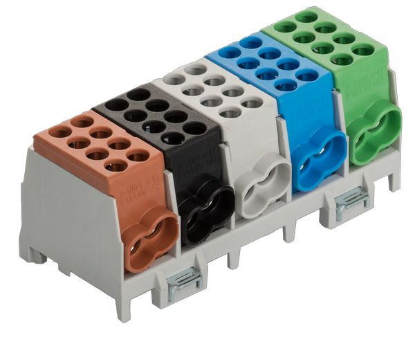 1 x braun / brown / brune, 1 x schwarz / black / noir, 1 x grau / grey / gris, 1 x blau / blue / bleu, 1 x grün / green / vert, mehrpolig, Schnellbefestigung aus Stahlblech, Doppel-Schnellbefestigung bei 4- u. 5-pol., Minimodular kompatibel, multipole, quick snap-on, galvanized steel, 2-fold locking for 4- and 5-pole, extendable with the mini modular range, multi polaire, attache rapide d‘acier galvanisé, 2 attaches rapide pour 4 et 5 pôle, compatible avec le système mini-modulaire