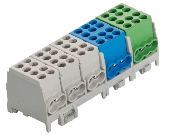 3 x grau / grey / gris,1 x blau / blue / bleu,1 x grün / green / vert,mehrpolig, Schnellbefestigung aus Stahlblech, Doppel-Schnellbefestigung bei 4- u. 5-pol., Minimodular kompatibel, VDE-zertifiziert, multipole, quick snap-on, galvanized steel, 2-fold locking for 4- and 5-pole, extendable with the mini modular range, VDE certified, multi polaire, attache rapide d‘acier galvanisé,2 attaches rapide pour 4 et 5 pôle, compatible avec le système mini-modulaire,certifié par VDE
