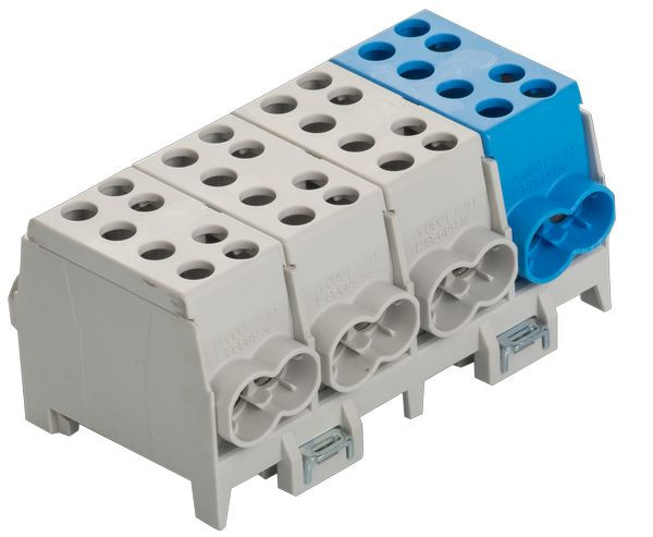 3 x grau / grey / gris, 1 x blau / blue / bleu, mehrpolig, Schnellbefestigung aus Stahlblech, Doppel-Schnellbefestigung bei 4- u. 5-pol., Minimodular kompatibel, VDE-zertifiziert, multipole, quick snap-on, galvanized steel, 2-fold locking for 4- and 5-pole, extendable with the mini modular range, VDE certified, multi polaire, attache rapide d‘acier galvanisé, 2 attaches rapide pour 4 et 5 pôle, compatible avec le système mini-modulaire, certifié par VDE