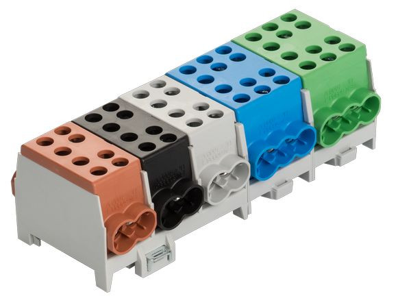 1 x braun / brown / brune, 1 x schwarz / black / noir, 1 x grau / grey / gris, 1 x blau / blue / bleu, 1 x grün / green / vert, mehrpolig, Schnellbefestigung aus Stahlblech, Doppel-Schnellbefestigung bei 4- u. 5-pol., Minimodular kompatibel, VDE-zertifiziert, multipole, quick snap-on, galvanized steel, 2-fold locking for 4- and 5-pole, extendable with the mini modular range, VDE certified, multi polaire, attache rapide d‘acier galvanisé, 2 attaches rapide pour 4 et 5 pôle, compatible avec le système mini-modulaire, certifié par VDE