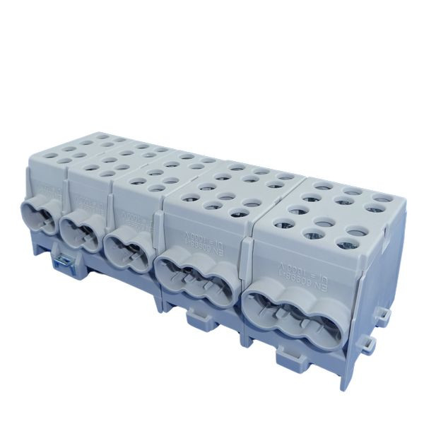 5 x grau / grey / gris, mehrpolig, Schnellbefestigung aus Stahlblech, Doppel-Schnellbefestigung bei 4- u. 5-pol., Minimodular kompatibel, VDE-zertifiziert, multipole, quick snap-on, galvanized steel, 2-fold locking for 4- and 5-pole, extendable with the mini modular range, VDE certified, multi polaire, attache rapide d‘acier galvanisé, 2 attaches rapide pour 4 et 5 pôle, compatible avec le système mini-modulaire, certifié par VDE