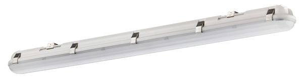 LN 120 1200mm PCO 1x17/23/32/38W 115° 2800/3800/4600/5400lm, 4000K, SK I, ohne DV. LN 120 Feuchtraum-Wannenleuchte, flexibel einstellbar in vier Leistungsstufen. Schlagfestes Polycarbonat (IK08), IP65 geschützt, Silikonschaumdichtung. LED-Einheit integriert, einfache Montage mit PRACHT-KLAMMERSYSTEM. Einspeisung stirn-, kopf- und mittig möglich, Zubehör für Durchgangsverdrahtung. Ideal für Parkhäuser, Keller und Werkstätten.