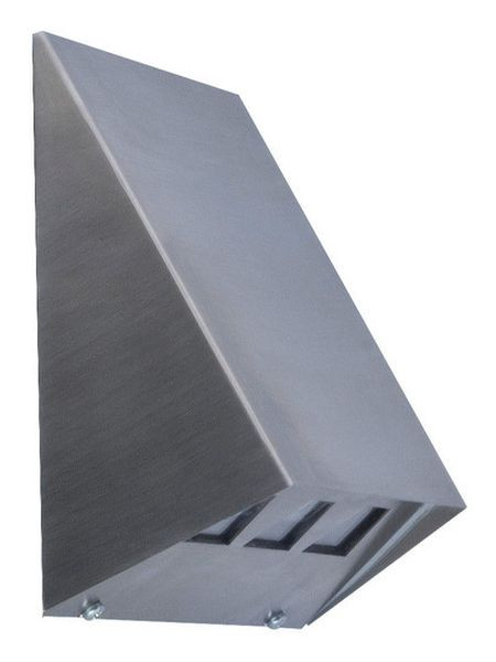Gehäuse aus Edelstahlblech in dreieckigem Design mit Lichtaustrittsfläche nach unten. High-Power-LED mit Lichtlenkung durch spezielle Linsen für asymmetrische Lichtverteilung (Beleuchtung von Wegen mit 1 lx) oder für symmetrische Lichtverteilung (Beleuchtung von Flächen mit 0,5 lx). Versionen für Wandanbau oder mit zusätzlichem Zubehör für Poller.