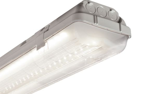 Leuchte hoher Schutzart: Gehäuse aus Polycarbonat mit klarer Abdeckung aus Polycarbonat, mikroprismatisch und weißem Reflektor aus Stahlblech. Verschlüsse aus Polycarbonat / Glasfaser. Lichtverteilung tief-breitstrahlend. Ideal für erhöhte Beanspruchung im Innen- und überdachten Außenbereich. Lineares LED-Modul. Elektronischer LED-Treiber. Version für Wand- oder Deckenanbau oder Ketten- / Seilabhängung.