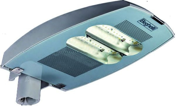 Strassen- und Wegeleuchte: Gehäuse aus druckgegossenem Aluminium und Scheibe aus Hartglas. Gehäuseober- und Gehäuseunterteil mit Scharnieren verbunden und durch Edelstahl-Verschlüsse verschlossen. Lichtlenkung durch segmentierte Reflektoren aus hochglänzendem Aluminium, asymmetrisch breitstrahlend oder asymmetrisch extrem breitstrahlend für Strassen und asymmetrisch extrem breitstrahlend für Wege. Integrierter SmartDriver als LED-Driver mit: Dimmung von 0 % bis 100 %, Speicherung des Energieverbrauches, Speicherung der Betriebsstunden. Version für Mastaufsatz oder Mastansatz.