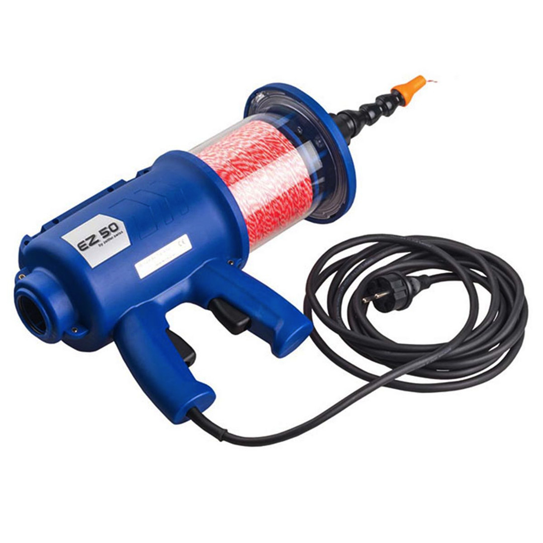 Mit dem Schnureinblasgerät EZ 50 sind bis zu mindestens 300 m Einzug in Rohren von 18 bis 50 mm Innenrohrdurchmesser möglich. Das Gerät lässt sich in wenigen Sekunden zum Einblasen oder Ansaugen umrüsten, sodass es auch bei engsten Platzverhältnissen für Flexrohre, Rohrauslässe, Abzweigkästen, Dosen oder Lampenauslässe genutzt werden kann. Selbst bei geknickten oder gequetschten Rohren kann die Zugschnur eingeblasen werden, mit der anschließend das Kabel direkt eingezogen wird. Die strombetriebene EZ 50 eignet sich besonders für Installationen in Wohn-, Gewerbe- und Industriebauten. Das EZ 50 Schnureinzugsgerät wird im handlichen Koffer mit zwei Rollen Schnur á 900m mit einem Durchmesser von 1 mm und einer Zugfestigkeit bis 24 kg sowie weiteren Kleinteilen geliefert. Wir führen weitere Geräte, die sich für die Anwendung im Tiefbau und Industrieanlagen, Strombetrieben oder im Tiefbau und Industrieanlagen, mit Benzinmotor eignen.