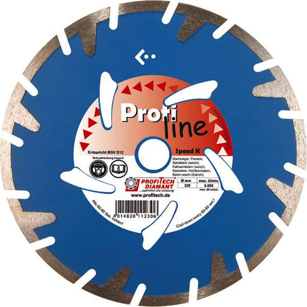Diamant-Trennscheiben, Speed K, blau, geprüft nach DIN EN 13236 für Wandschlitzfräsen und Winkelschleifer, Trockenschnitt mit Sicherheitsstahlkern und Hochleistungsdiamanten Einsatz : Beton weich, Dachziegel ,Sandstein, Putz, Gasbeton, Blähbeton, Schamotte, Poroton, Hohlblockstein, Schiefer