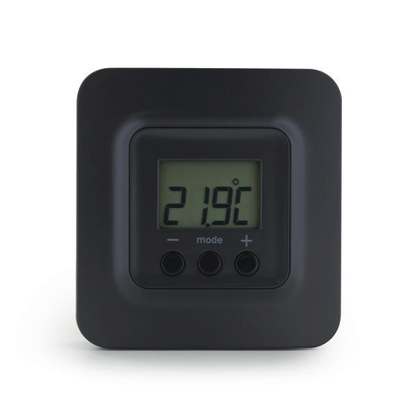 Der Tybox 5101 BK ist eine Raumbedieneinheit mit Display zum Einstellen der Raumtemperatur in der Farbe anthrazit. Er kann mit einem Empfänger zur Steuerung von Elektroheizungen, elektrischen Fußbodenheizungen oder Warmwasserheizungen verbunden werden. Wenn er einem Empfänger zugeordnet ist, zeigt er die Raumtemperatur an und ermöglicht das Ändern der Solltemperatur. Man kann bis zu 16 Empfänger an einem Zonenthermostat zuzuordnen. Die kleine Größe ermöglicht die diskrete Installation und die Sollwertbereiche lassen bequem sperren. Er ist kompatibel mit der Tydom Smart Home-Schnittstelle zur Fernsteuerung des Systems auch über über einem Sprachassistenten. Dank der Frühstartfunktion beim Start der Heizung mit der Tydom Smart Home-Schnittstelle haben Sie noch mehr Komfort und Einsparungen. Die Rückmeldung ermöglicht es, aus der Ferne die Raumtemperatur zu erfahren.