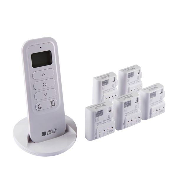 Das Set Pack Tyxia 541 besteht aus 5 x Empfängern Tyxia 5630 und 1 Tyxia 1716 Gruppenfernbedienung und ist für die Zentralisierung von Rollläden. Dieser Funk-Empfänger Tyxia 5630 ist ideal für Rolllädenmotoren bis 1 A (+/- 30 Nm). Er verfügt über eine 230 V-Stromversorgung. Der Empfänger steuert einen Rollladen, eine Leinwand oder ein motorisiertes Dachfenster. Seine kompakte Größe ermöglicht die einfache Installation in Unterputzdosen, ein schneller Anschluss durch die Steckverbinder sowie das automatische Einlernen der Fahrzeiten vereinfachen zudem die Inbetriebnahme. Der Empfänger ist mit den drahtgebundenen Rollladenmotoren anderer Hersteller kombinierbar. Die Speicherung von 2 programmierbaren Zwischenstellungen für den Rollladen (festgelegte Höhe) sind möglich. Die Zustandsanzeige der Rollladenposition erfolgt auf der Bedieneinheit oder aus der Ferne auf der App (wenn vorhanden). Die Tyxia 1716 ist eine Fernbedienung für eine Gruppe von Beleuchtungen und Rollläden mit Steuerung im Leise-Modus. Sie steuer einen einzelnen Rollladen oder bis zu 16 Rollladengruppen in der in der Betriebsart Auf/Stopp/Ab und 16 Gruppen von Beleuchtungen in der Betriebsart Ein/Aus in Verbindung mit kompatiblen Empfängern. Beim Öffnen oder Schließen der mit Tymoov RP2-Motoren ausgestatteten Rollläden durch langes Drücken der Bedientaste wird der Leise-Modus ausgelöst. Eine Kontrollleuchte bestätigt, dass die Geräte den gesendeten Befehl empfangen haben.