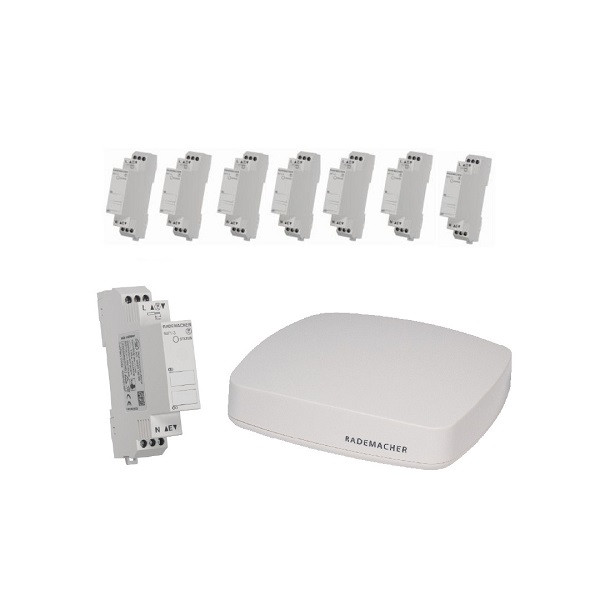 "Das Starterpaket Hutschienen Rohrmotor-Aktor enthält einen HomePilot® (34200819) und acht DuoFern Hutschienen Rohrmotor-Aktoren 9471-3 (35200662).Der HomePilot ist die zentrale Steuereinheit für alle RADEMACHER Funk-Produkte, für bis zu 100 Geräte. Über ihn lassen sich die eingebundenen Geräte - Rollläden, Raffstoren, Markisen, Heizung, Licht uvm. steuern. Der Zugriff kann über PC, Smartphone, Tablet oder am Gerät selbst erfolgen. Die Funk-Geräte können auch von unterwegs über die kostenlose App gesteuert werden. Das HomePilot-System kann via Sprachsteuerung bedient werden. Eine Erstellung von Gruppen, Szenen und Automationen rundet die Möglichkeiten ab. Alle Geräte, Szenen etc. können mit individuellen Namen versehen werden. Sämtliche Geräteinfos, Szenen und automatischen Abläufe sind lokal auf dem Gerät gespeichert.Mit dem funkfähigen DuoFern Hutschienen Rohrmotor-Aktor können konventionelle Rollladen- oder Raffstoremotore einfach in das Smart Home System von RADEMACHER integriert werden. Seine Bauform ermöglicht die normgerechte DIN-Rail-/Hutschinenmontage auf einer Tragschiene (T35) und hat die Montagebreite von 1 Teilungseinheit. Durch den Einsatz von Sensoren oder Sendern erhält der DuoFern Hutschienen Rohrmotor-Aktor zahlreiche Automatisierungsmöglichkeiten oder kann in Verbindung mit dem HomePilot per App gesteuert werden. Ebenfalls kann über den HomePilot eine Blockiererkennung bei mechanischen Rohrmotoren zugeschaltet werden. Über die Anschlussmöglichkeit von Rollladenschaltern oder Tastern kann der Rollladen oder Raffstoremotor natürlich jederzeit auch weiterhin manuell bedient werden. "