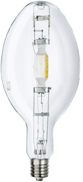 HM-Lampe mit Quarzbrenner, Ellipsoidkolben klar, hoher Lichtstrom, Sockel E40. Betrieb in geschlossener Leuchte, mit Vorschalt- und Zündgerät.