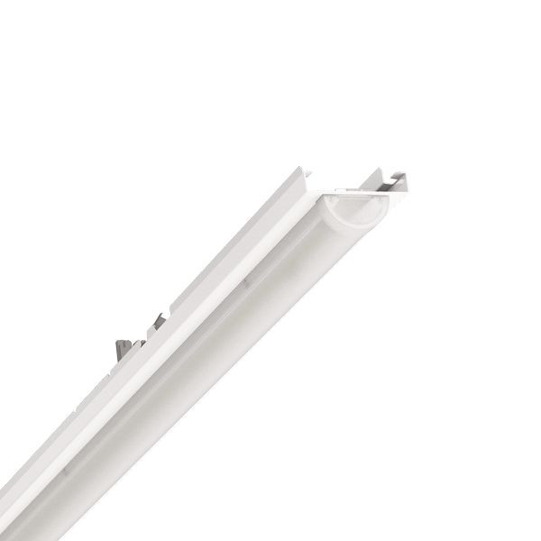 Geräteträger, aus verzinktem, profiliertem Stahlblech Oberfläche mit Polyesterharz beschichtet. Werkzeuglose Befestigung mit design-integrierten Druckverschlüssen gewährleisten einen Diebstahl- und Demontageschutz. LED-Einheit in Gehäuselänge für optisch durchlaufendes Lichtband. Gehäusefarbe verkehrsweiß RAL 9016. Diffusoroptik, Lichtverteilung direkt/indirekt diffus-strahlend mittels Diffusor geeist aus Kunststoff PC, Durchlaufende Lichtband-Optik.
