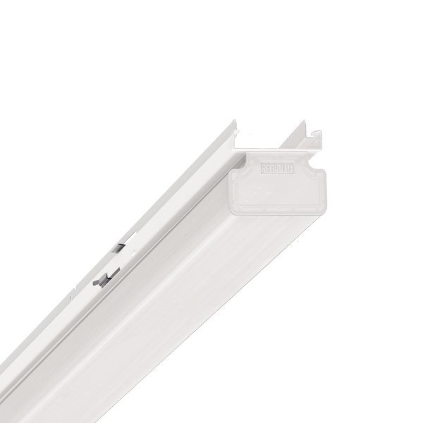 Geräteträger, aus verzinktem, profiliertem Stahlblech Oberfläche mit Polyesterharz beschichtet. Werkzeuglose Befestigung mit integrierten seitlichen Hebelverschlüssen für das schnelle Einsetzen in die Tragschiene. LED-Einheit in Gehäuselänge für ein optisch durchlaufendes Lichtband. Diffusoroptik, Lichtverteilung direkt/indirekt strahlend mittels Diffusor opal aus Kunststoff PMMA, mit innenliegenden Längsprismen, erzeugt ein gleichmäßiges homogenes Erscheinungsbild mit Deckenaufhellung. Wärmebeständige Leitungen einschließlich festpositioniertem 3-poligen Schnellmontage-Steckerteil mit werkzeugloser Phasenvorwahl und Suchfinger.