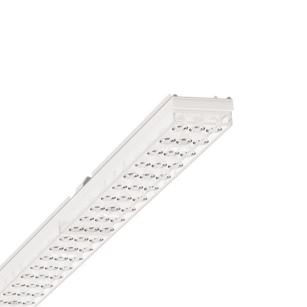 Geräteträger aus verzinktem, profiliertem Stahlblech mit Zinkauflage kombiniert mit Polyesterharzlack gewährleisten einen guten Korrosionschutz, Werkzeuglose Befestigung mit design-integrierten Druckverschlüssen gewährleisten einen Diebstahl- und Demontageschutz. Integrierte Stirnseiten aus Kunststoff mit Dichtlippen und eine umlaufend geschlossene Dichtung zur Tragschiene für Schutzart bis IP64. Gehäusefarbe verkehrsweiß RAL 9016. Lichtverteilung direkt doppelt asymmetrisch strahlend mittels Individual.Lens.Optic aus Kunststoff PMMA, die Einzellinsenoptik enthält eine transparente Dichtung, sorgt für eine hohe Montagefreundlichkeit und ist wartungsfreundlich durch leicht zu reinigende Oberfläche. Der Rhythmus der 3-reihigen Einzellinsen-Anordnung ist innerhalb und Geräteträger übergreifend perfekt aufeinander abgestimmt und gewährleistet ein homogenes Erscheinungsbild im Objekt. Geeignet für Bildschirmarbeitsplätze, rundumentblendet 65° < 3000 cd/qm nach aktueller Norm DIN-EN 12464-1. Wärmebeständige Leitungen einschließlich festpositioniertem 5-poligen Schnellmontage-Steckerteil mit werkzeugloser Phasenvorwahl und Suchfinger.