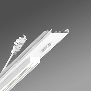 Geräteträger-Einsatz mit integrierter Universal-Dreiphasenstromschiene mit Dali (nutzbare Länge 660 mm) aus verzinktem, profiliertem Stahlblech zur Kombination von Akzent- und Allgemeinbeleuchtung, Oberfläche mit Polyesterharzlack beschichtet, mit Drehverschlüssen für das schnelle Einsetzen in die Tragschiene. Gehäusefarbe verkehrsweiß RAL 9016. Elektrische Verbindung mittels festpositioniertem 5-poligen Schnellmontage-Steckerteil mit freier Phasenvorwahl. Integrierte Führungshilfe zum schnellen Kontaktieren. Geeignet für Leuchten mit 3-Ph.-Stromsch.-Adapter (ET) von Regiolux, Global Trac, Eutrac, Iguzzini, Ivela, Powergear, Reggiani, Targetti, Zumtobel und 5-Ph.Stromsch.-Adapter (DALI) von Regiolux, Global Trac.