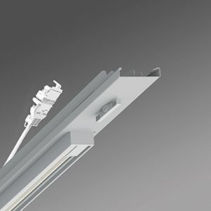 Geräteträger-Einsatz mit integrierter Universal-Dreiphasenstromschiene mit Dali (nutzbare Länge 660 mm) aus verzinktem, profiliertem Stahlblech zur Kombination von Akzent- und Allgemeinbeleuchtung, Oberfläche mit Polyesterharzlack beschichtet, mit Drehverschlüssen für das schnelle Einsetzen in die Tragschiene. Gehäusefarbe silbergrau/weißaluminium RAL 9006. Elektrische Verbindung mittels festpositioniertem 5-poligen Schnellmontage-Steckerteil mit freier Phasenvorwahl. Integrierte Führungshilfe zum schnellen Kontaktieren. Geeignet für Leuchten mit 3-Ph.-Stromsch.-Adapter (ET) von Regiolux, Global Trac, Eutrac, Iguzzini, Ivela, Powergear, Reggiani, Targetti, Zumtobel und 5-Ph.Stromsch.-Adapter (DALI) von Regiolux, Global Trac.