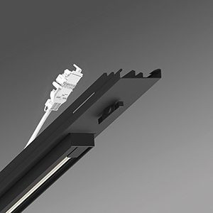 Geräteträger-Einsatz mit integrierter Universal-Dreiphasenstromschiene mit Dali (nutzbare Länge 660 mm) aus verzinktem, profiliertem Stahlblech zur Kombination von Akzent- und Allgemeinbeleuchtung, Oberfläche mit Polyesterharzlack beschichtet, mit zwei Drehverschlüssen für das schnelle Einsetzen in die Tragschiene. In der Tragschiene variabel positionierbar. Gehäusefarbe schwarz RAL 9005. Elektrische Verbindung mittels Anschlussleitung 1 m zur variablen Geräteträgerpositionierung im Lichtband mit 5-poligen Schnellmontage-Steckerteil mit freier Phasenvorwahl.