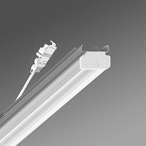 Geräteträger, aus verzinktem, profiliertem Stahlblech Oberfläche mit Polyesterharz beschichtet. Werkzeuglose Befestigung mit integrierten seitlichen Hebelverschlüssen für das schnelle Einsetzen in die Tragschiene. LED-Einheit in Gehäuselänge für optisch durchlaufendes Lichtband. In der Tragschiene variabel positionierbar. Diffusoroptik, Lichtverteilung direkt/indirekt tief-/breitstrahlend mittels Diffusor satiniert mit innenliegender Längsprismatik aus Kunststoff PMMA, der leicht statinierte Diffusor aus Kunststoff PMMA, mit innenliegender Längsprismatik, erzeugt ein gleichmäßiges homogenes Erscheinungsbild mit Deckenaufhellung. Elektrische Verbindung mittels Anschlussleitung 1 m zur variablen Geräteträgerpositionierung im Lichtband mit 5-poligen Schnellmontage-Steckerteil mit freier Phasenvorwahl..