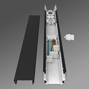 mit 2-fach Anschlussklemme 7x1,5-2,5mm² für flexible und starre Zuleitung, inkl. Verbinder und Blindabdeckung. Tragschiene aus profiliertem, verwindungssteifen Stahlblech, vorverzinkt, Blindabdeckung und Schienenverinder für SRT-Schnellmontagesystem Modullänge /500, Gehäusefarbe schwarz RAL 9005. Ausspeisung mittels Stecker und Leitung mit 2-fach steckbarer Anschlussklemmen 7x1,5-2,5mm², zum Anschluss von flexibler und starrer Zuleitung als Mitteleinspeisung mit Einspeiseadapter SRTA-7E geeignet,. für SRT.