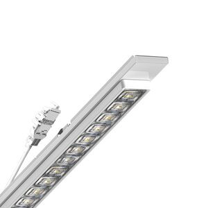 Geräteträger aus verzinktem, profiliertem Stahlblech, Oberfläche mit Polyesterharz beschichtet. Werkzeuglose Befestigung mit design-integrierten Druckverschlüssen gewährleisten einen Diebstahl- und Demontageschutz. In der Tragschiene variabel positionierbar. Lichtverteilung direkt tief-/breitstrahlend mittels OptiLens® aus Kunststoff PMMA, diese verbindet schlankes Design mit herausragender Funktionalität und sorgt für eine gleichmäßige angenehme Oberflächenausleuchtung. Die optisch brillanten, großflächigen, kissenförmigen und homogen ausgeleuchteten Linsen sorgen für eine besondere Ästhetik und einem niedrigen UGR-Wert. Die Lichttechnik reduziert Multishadow-Effekte und realisiert ein ausgewogenes Verhältnis zwischen Effizienz, guter Entblendung und kompakten Abmessungen für außergewöhnlichen Sehkomfort. Elektrische Verbindung mittels Anschlussleitung 1 m zur variablen Geräteträgerpositionierung im Lichtband mit 5-poligen Schnellmontage-Steckerteil mit freier Phasenvorwahl.