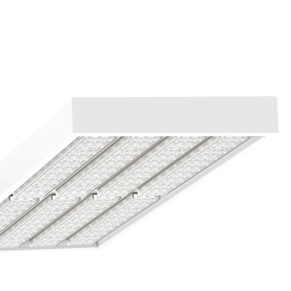 Stahlblechgehäuse pulverlackiert, rechteckiger Querschnitt, mit stabilen Stahlstirnseiten, Gehäuserückseite mit integrierten Einziehmuttern zur Befestigung des Zubehörs für Deckenmontage und Kettenabhängung von außen. Lichtverteilung direkt breitstrahlend mittels Individual.Lens.Optic aus Kunststoff PMMA. Treiber integriert. Elektrischer Anschluss über 2,3m lange Anschlussleitung 5x1,0mm².