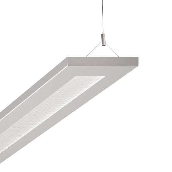 Stahlblechgehäuse, flacher rechteckiger Querschnitt, sichtbare Bauhöhe 26mm, Stirnseiten aus Stahl, Gehäusefarbe silbergrau/weißaluminium RAL 9006. Lichtverteilung direkt/indirekt strahlend mittels Diffusor micro-prismatisch aus PMMA. Geeignet für Bildschirmarbeitsplätze, rundumentblendet 65° < 3000 cd/qm nach aktueller Norm DIN-EN 12464-1. Elektrischer Anschluss über integrierte transparente Anschlussleitung 5x0,75mm², Länge 1900mm, Leitungsenden abgemantelt.