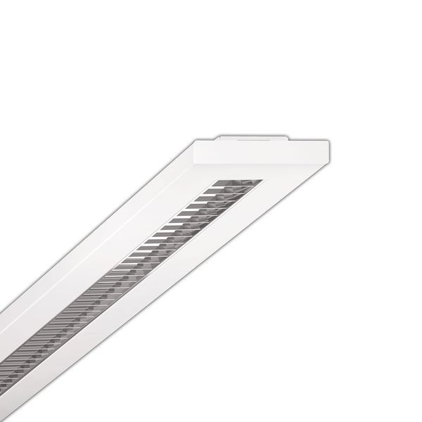 Stahlblechgehäuse, flacher rechteckiger Querschnitt, sichtbare Bauhöhe 26mm mit 30mm Deckanabstand, Stirnseiten aus Stahl, Lichtverteilung direkt strahlend mittels MIRO-SILVER® Micro-Parabolraster seidenmatt aus Aluminium, reflexionsverstärktem Aluminium-Parabolraster seidenmatt mit Niederquerschnitts-Lamellen, selbstrastend. 65° < 1500 cd/qm nach aktueller Norm DIN-EN 12464-1. Elektrischer Anschluss über 3-polige Anschlussklemme in Steckkontakt-Technik.