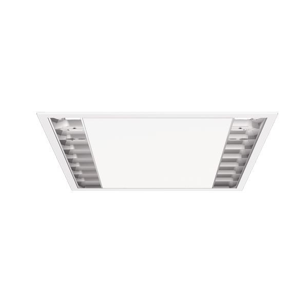 Stahlblechgehäuse geeignet für Decken mit sichtbaren T-Schienen, verdeckt symmetrischen Schienenkonstruktionen und ausgeschnittene Decken, Gehäusefarbe verkehrsweiß RAL 9016. Lichtverteilung direkt strahlend mittels MIRO® Parabolraster seidenmatt aus Aluminium, reflexionsverstärktem, selbstrastend, beidseitig abklappbar. Geeignet für Bildschirmarbeitsplätze, rundumentblendet 65° < 1000 cd/qm nach aktueller Norm DIN-EN 12464-1. Elektrischer Anschluss über 3-polige Anschlussklemme in Steckkontakt-Technik.