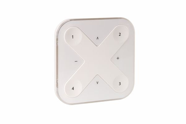 weiß Office Kunststoff, weiß. Batteriebetrieben, kann es ohne elektrischen Anschluss direkt auf die Wand montiert oder einfach als Fernbedienung genutzt werden. Bluetooth Low Energy 2,4–2,483 GHz. Lithium-Batterie CR2430 enthalten, magnetische Wandhalterung beiliegend. Bluetooth Low Energy / BLE User-Interface mit 4 Tastern zum Aufrufen von Szenen. Jeweils 2 Taster zur Lichtsteuerung und Farblichtsteuerung. Das Interface kann in einem Casambi-Netzwerk integriert