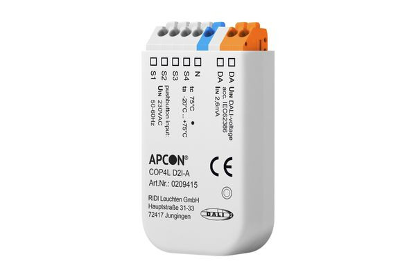 DALI-2 Tastenkoppler zur Anbindung von 4x Tastern, Schalter und anderer Schaltelemente. Kunststoff, weiß. Einbau in Installationsdose. Max. Leitungslänge 50 m. Den vier 230 V-Wechselspannungseingängen können über Software Lichtszenen, direkte Lichtwerte, Zeitverläufe, Ein- und Ausschaltbefehle, Befehle zum Dimmen und zur Farblichtsteuerung zugewiesen werden. Aktivierter integrierter Application Controller, kann durch Umkonfiguration in Instanzenmodus versetzt werden. Konfiguration über die APP "DALI Cockpit Mobile" oder über die PC-Software "DALI Cockpit".