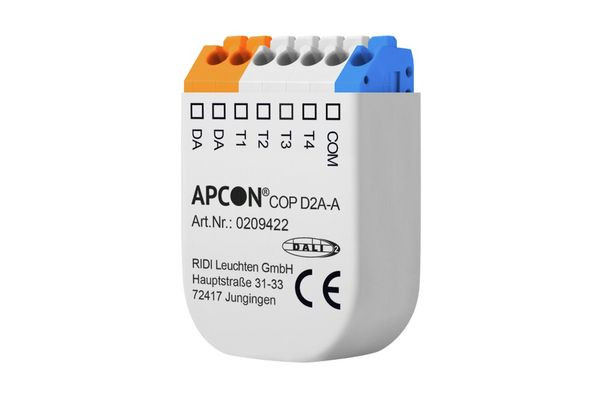 DALI-2 Tastenkoppler zur Anbindung von 4x Tastern, Schalter und anderer Schaltelemente. Kunststoff, lichtgrau, ähnlich RAL 7035. Geeignet für den Wandeinbau in Installationsdosen. Max. Leitungslänge 0,5 m. Diesen 4 potentialfreien Eingängen können über Software Lichtszenen, direkte Lichtwerte, Zeitverläufe, Ein- und Ausschaltbefehle, Befehle zum Dimmen und zur Farblichtsteuerung zugewiesen werden. Aktivierter integrierter Application Controller, kann durch Umkonfiguration in Instanzenmodus versetzt werden. Konfiguration über die APP "DALI Cockpit Mobile" oder über die PC-Software "DALI Cockpit".