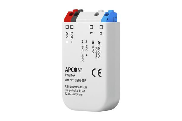 Gleichspannungsversorgung 24 V/ 130 mA. Kunststoff, lichtgrau, ähnlich RAL 7035. Geeignet für den Wandeinbau in Installationsdosen.